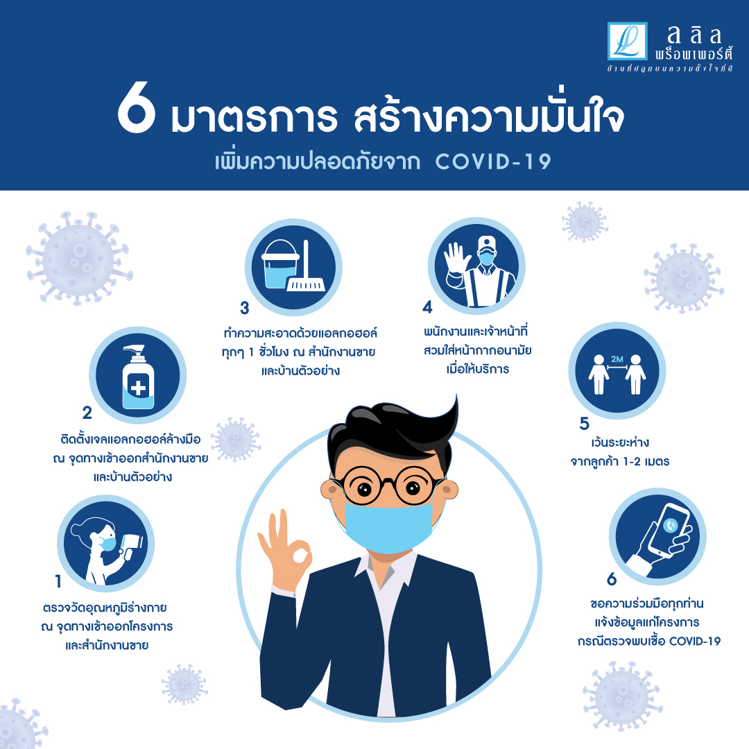 โดยเริ่มจากการตรวจวัดอุณหภูมิบริเวณจุดเข้าออกโครงการและสำนักงานขาย จัดเตรียมจุดเจลแอลกอฮอล์ พร้อมทำความสะอาดพื้นที่ด้วยแอลกอฮอล์ทุกชั่วโมง เจ้าหน้าที่ทุกคนที่ให้บริการมีการสวมใส่หน้ากากอนามัยตลอดเวลา และเว้นระยะห่างจากลูกค้า 1-2 เมตร รวมทั้งบริษัทฯ ได้ขอความร่วมมือลูกค้าที่ใช้บริการแจ้งกลับกรณีตรวจพบเชื้อ COVID-19