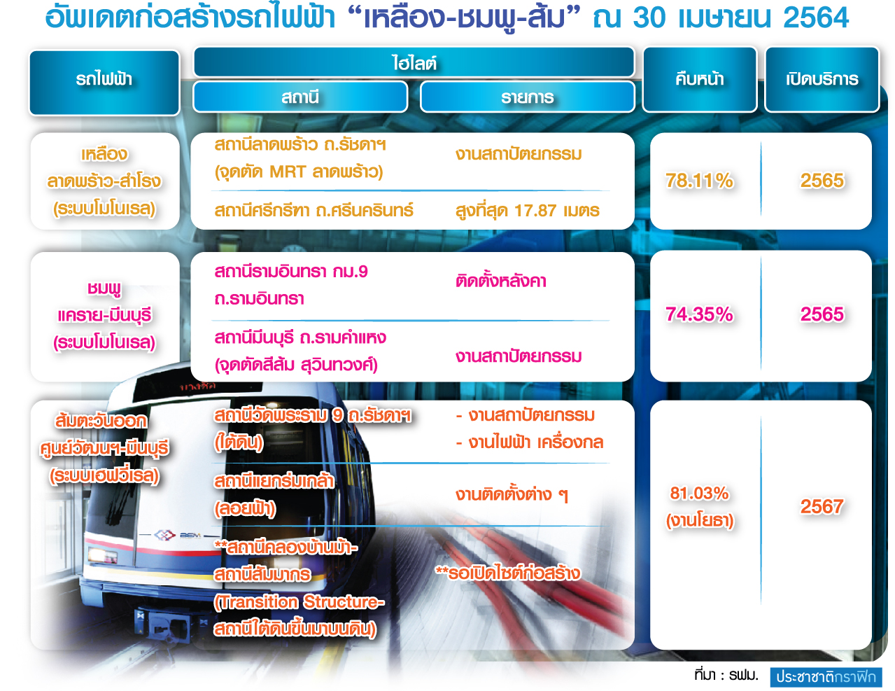 เดินไปตามเดดไลน์เปิดบริการในปี 2565 รถไฟฟ้าสายสีเหลือง-สีชมพู ส่วนสายสีส้มตะวันออก งานโยธามีความก้าวหน้า 80%