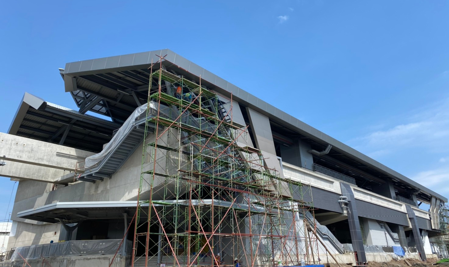 ปัจจุบันมีความคืบหน้าที่สำคัญในส่วนของ “สถานีรามอินทรา กม.9” ถนนรามอินทรา กำลังติดตั้งหลังคาสถานีและงานสถาปัตยกรรมหลังคา
