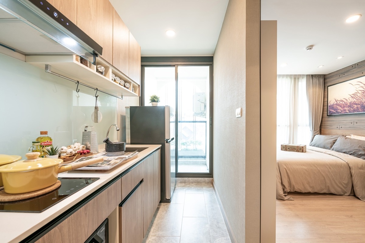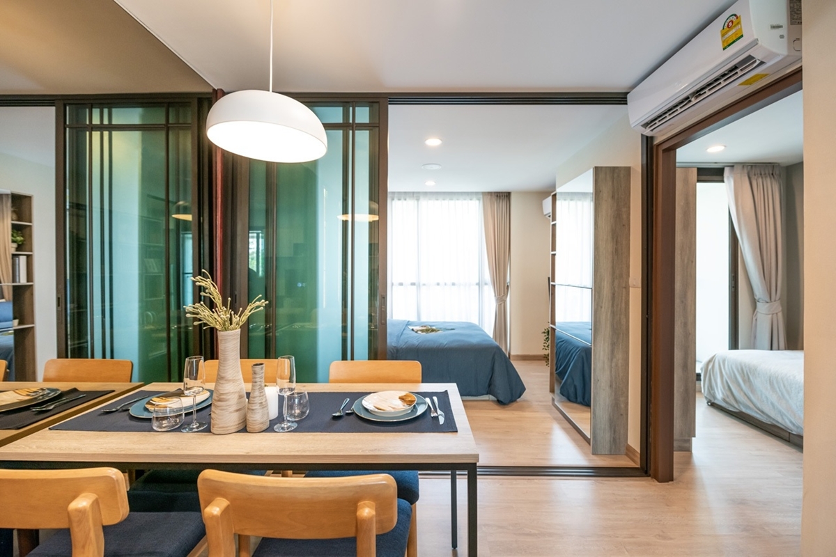 ฟรีค่าใช้จ่ายวันโอนกรรมสิทธิ์ เครื่องปรับอากาศ เตาไฟฟ้า เครื่องดูดควัน ชุดครัวบิ้วอิน (Built in) เฟอร์นิเจอร์ครบทั้งห้อง (Fully Furnished) และฉากกั้นห้องน้ำแบบกระจกนิรภัย (Tempered Glass)* มีขนาดห้องตั้งแต่ 28 – 43 ตารางเมตร แบบ 1 ห้องนอน และแบบ 2 ห้องนอน เพดานสูงโปร่งถึง 2.70 เมตร ตกแต่งให้มีบานเลื่อนสไลด์กั้นระหว่างห้องนอนและห้องนั่งเล่นให้มีความเป็นส่วนตัวมากยิ่งขึ้น