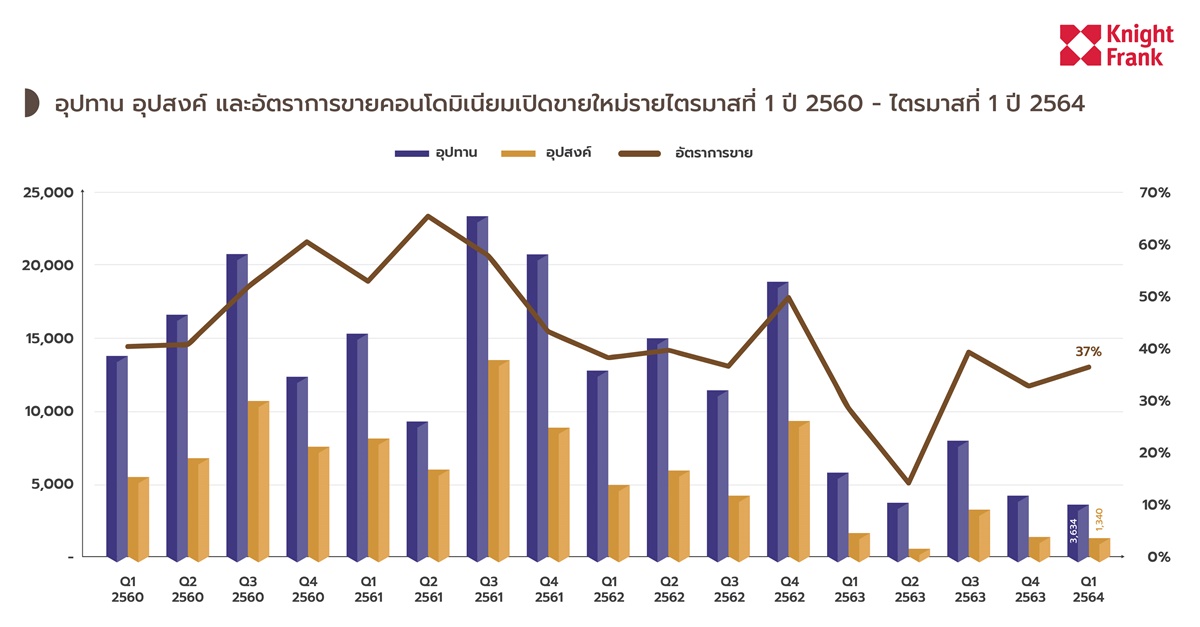 ในด้านดีมานด์มีหน่วยขายได้ใหม่ 1,340 หน่วย จากซัพพลายเปิดขายใหม่ในไตรมาส 1/64 จำนวน 3,634 หน่วย คิดเป็นอัตราการขาย 37% อัตราการขายเพิ่มขึ้น 7% เปรียบเทียบกับไตรมาส 1/63 และมีอัตราการขายเพิ่มขึ้น 4% เทียบกับไตรมาส 4/63 สาเหตุจากในช่วงเดือนมีนาคมที่ผ่านมาความต้องการคอนโดเริ่มมีการเคลื่อนไหวบ้างเล็กน้อย มีผู้เข้าเยี่ยมชมโครงการอย่างต่อเนื่อง ซัพพลายใหม่ราคาขายไม่สูงมาก ทำให้บางโครงบางทำเลทำยอดขายได้สูงถึง 80%