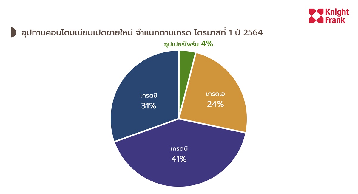 จากผลวิจัยของไนท์แฟรงค์ประเทศไทย พบว่า ตลาดคอนโดไตรมาส 1/64 ซัพพลายใหม่ค่อนข้างชะลอตัว เปิดขายใหม่ทั้งสิ้น 3,634 หน่วย ลดลง -41.8% เทียบกับไตรมาส 1/63 ส่วนใหญ่เป็นคอนโดเกรดบี ราคาตารางเมตรละ 80,000-150,000 บาท สัดส่วน 41% รองลงมาราคาต่ำกว่าตารางเมตรละ 80,000 บาท 31% ขณะที่คอนโดเกรดเอ ราคาเกินตารางเมตรละ 150,000 บาท สัดส่วน 24% และคอนโดระดับซุปเปอร์ไพร์ม 4%