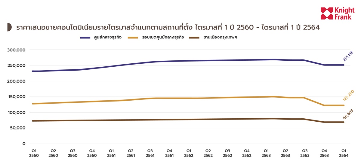 ในด้านราคาขายใหม่ของไตรมาส 1/64 ค่อนข้างทรงตัวหรือปรับลงเล็กน้อย แบ่งเป็นทำเลย่านศูนย์กลางธุรกิจเฉลี่ย 251,158 บาท/ตารางเมตร ปรับตัวลดลง -6.3% เทียบกับไตรมาส 1/63 และลดลง -0.1% เทียบกับไตรมาส 4/63, ทำเลรอบเขตศูนย์กลางธุรกิจ (City Fringe) เฉลี่ย 123,250 บาท/ตารางเมตร ลดลง -17.6% เทียบกับไตรมาส 1/63 ลดลง 0.2% เมื่อเทียบกับไตรมาส 4/63