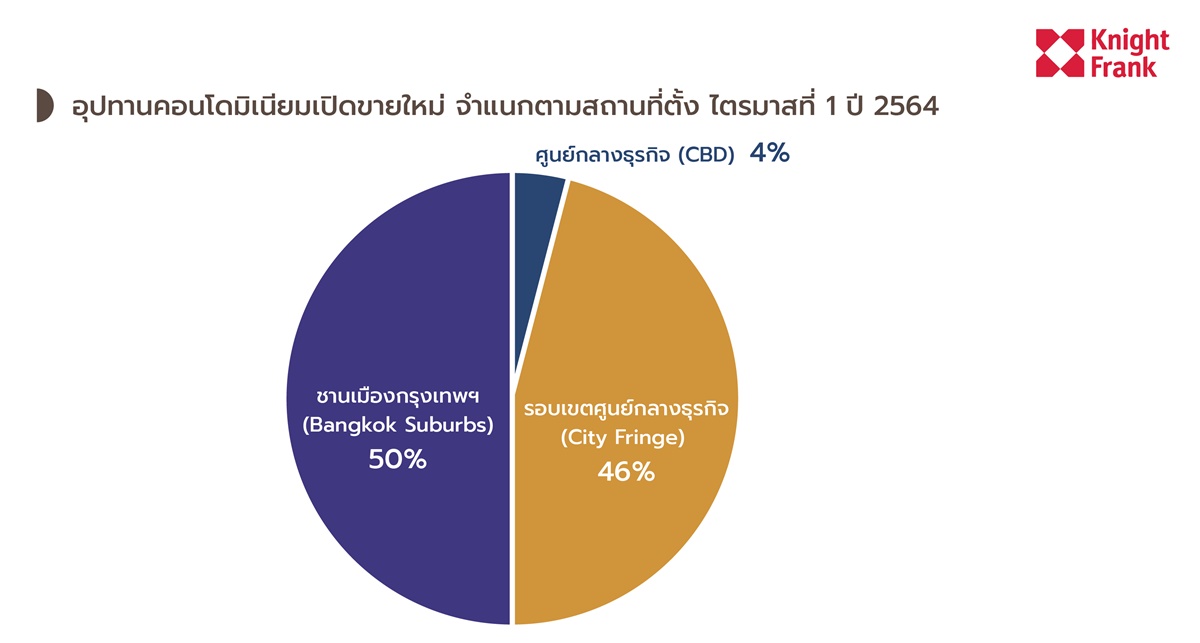 ทำเลเปิดใหม่อยู่บริเวณชานเมืองกรุงเทพฯ 50% ตามมาด้วยโซนรอบเขตศูนย์กลางธุรกิจ (City Fringe) 46% และคอนโดในย่านศูนย์กลางธุรกิจ (CBD) 4%