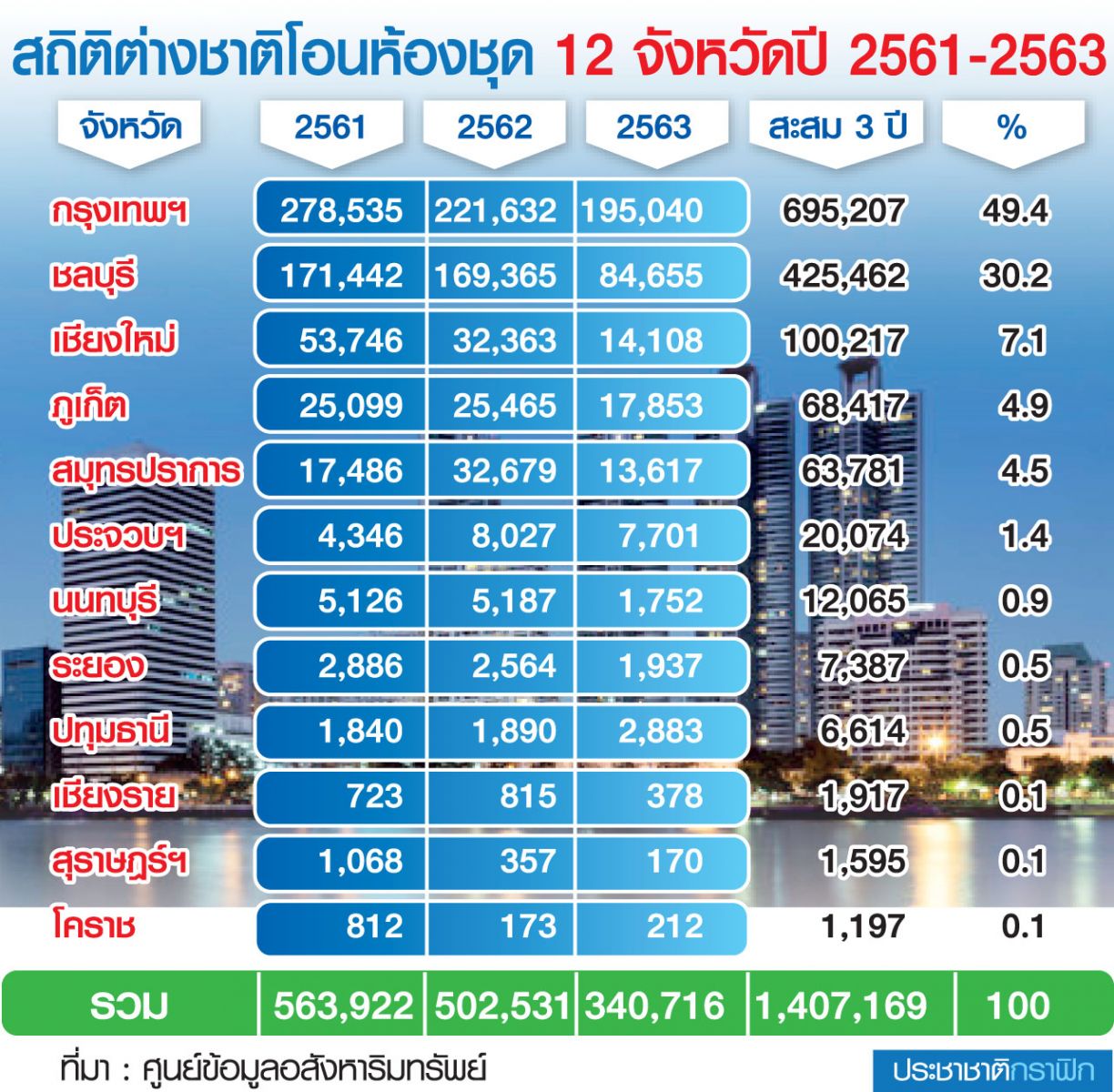สำหรับสถิติการโอนกรรมสิทธิ์ห้องชุดของคนต่างชาติทั้งประเทศในช่วงปี 2561-2563 มีพื้นที่สะสมรวมเพียง 1,408,310 ตร.ม. หรือเท่ากับ 34,651 หน่วย มูลค่ารวมกัน 145,577 ล้านบาท เฉลี่ยปีละ 469,437 ตร.ม. หรือ 11,550 หน่วย มูลค่าเฉลี่ย 48,526 ล้านบาท