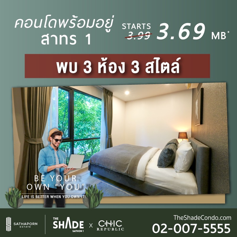 • โครงการ “เดอะ เชดด์ สาทร 1” (The SHADE Sathon 1) คอนโดมิเนียมพร้อมอยู่ ใจกลางเมืองย่านสาทร – พระราม 4 ใกล้ MRT สถานีลุมพินี มาพร้อม Smart Automation และพื้นที่ส่วนกลางขนาดใหญ่ กว่า 1,400 ตร.ม. ในราคาเริ่มต้นเพียง 3.69 ล้านบาท* จากราคา 3.99 ล้านบาท ดีลพิเศษฟรีค่าใช้จ่ายวันโอน จำนวนจำกัด*
