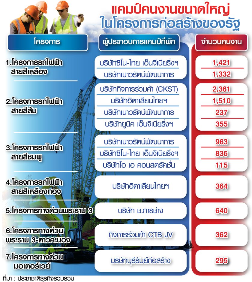 ผู้สื่อข่าว “ประชาชาติธุรกิจ” รายงานว่า บริษัทผู้รับเหมาที่ได้รับผลกระทบรอบนี้ ส่วนใหญ่เป็นโครงการของรัฐและโครงการพัฒนาอสังหาริมทรัพย์ที่มีคนงานอยู่ในแคมป์จำนวนมาก อาทิ โครงการรถไฟฟ้าสายสีเหลือง มีคนงาน 2,753 คน สายสีส้ม 4,463 คน สายสีชมพู 1,914 คน