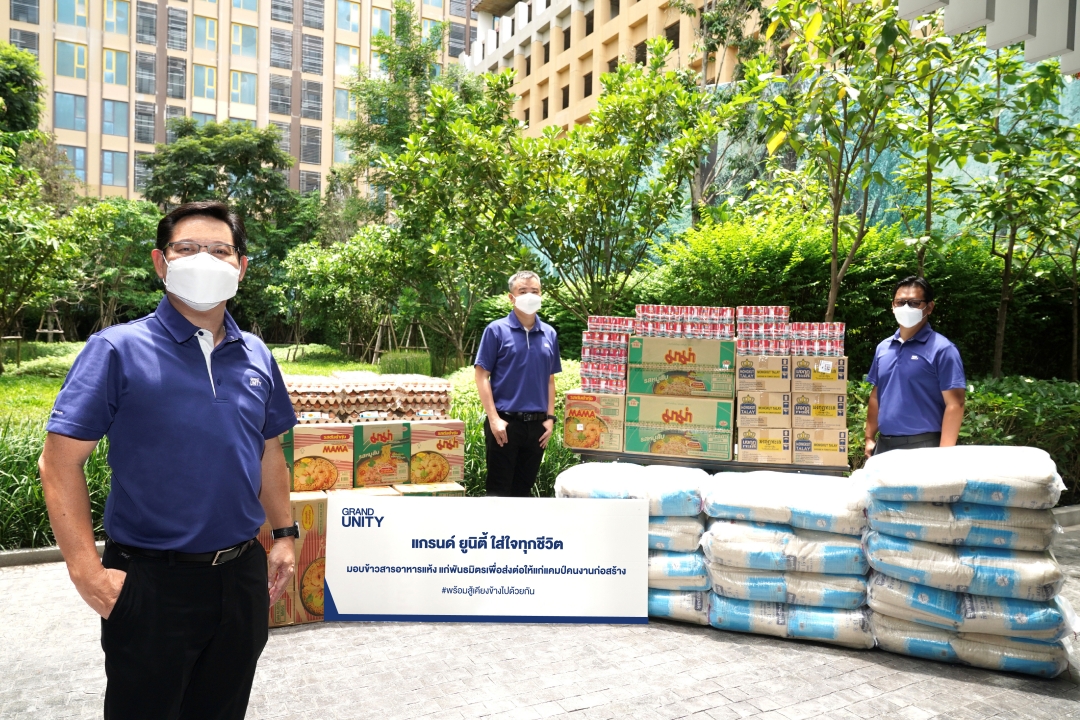 บริษัท แกรนด์ ยูนิตี้ ดิเวลล็อปเมนท์ จำกัด หรือ GRAND UNITY – “Makes Sense.” นำโดย (จากซ้ายไปขวา) นายพิพัฒณ์ นิยะถิรกุล ผู้อำนวยการอาวุโส สายงานพัฒนาผลิตภัณฑ์และวิศวกรรมก่อสร้าง พร้อมด้วย นายบุญเกียรติ พิจิตรอาภรณ์ และนายวิชัย ศรีพงษ์พันธุ์กุล ผู้ช่วยผู้อำนวยการฝ่ายก่อสร้าง เป็นตัวแทนบริษัทฯ มอบเครื่องอุปโภคบริโภคที่จำเป็นให้กับพันธมิตรด้านวิศวกรรมก่อสร้าง