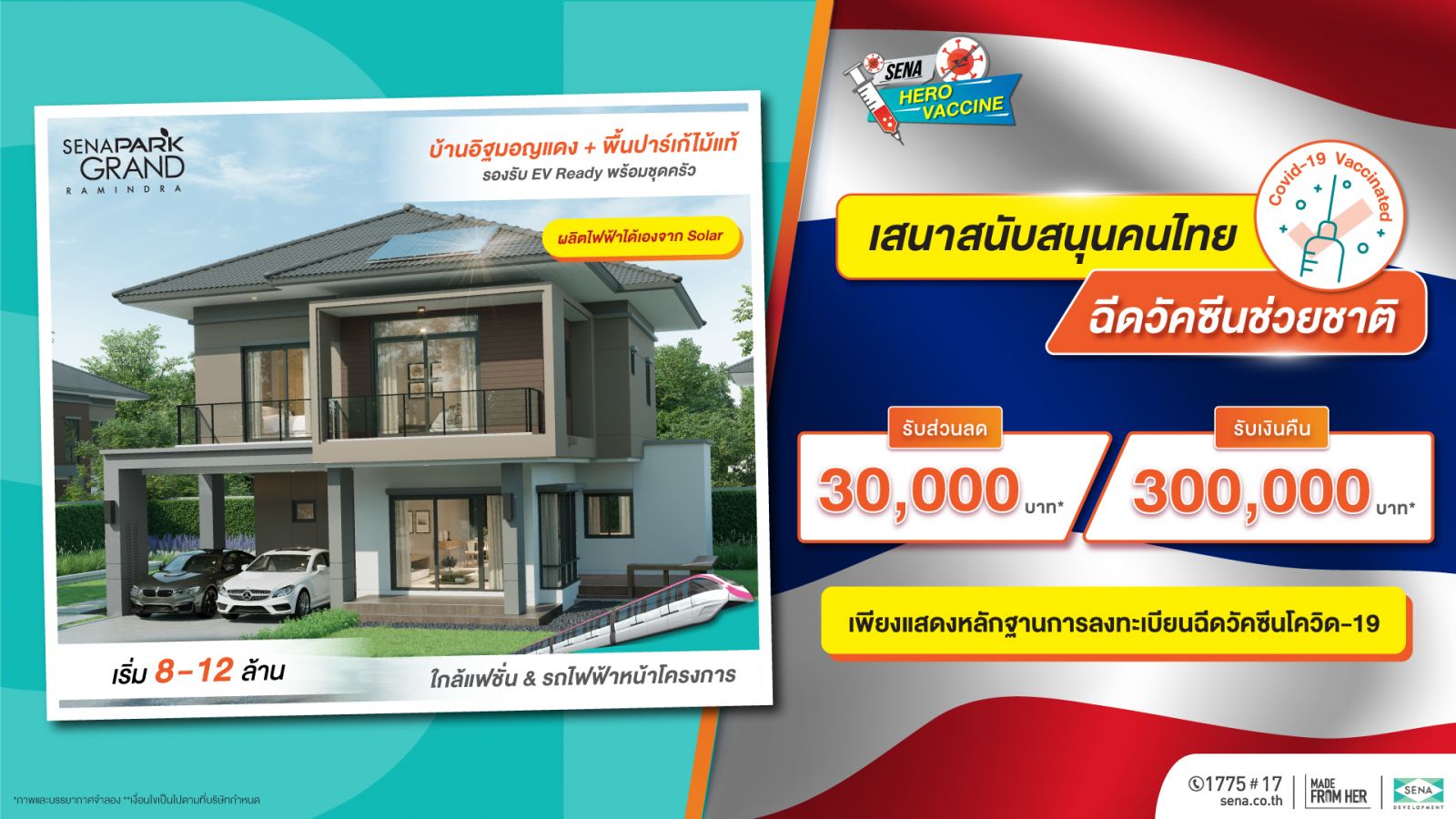 ล่าสุด เสนาร่วมรณรงค์ถกแขนเสื้อเพื่อเราทุกคนสนับสนุนคนไทยฉีดวัคซีนช่วยชาติ จัดโปรโมชันดี “SENA HERO Vaccine” โดยลูกค้าแสดงหลักฐานการลงทะเบียนฉีดวัคซีนโควิด-19 รับส่วนลดสูงสุด 500,000 บาทครอบคลุมโครงการใหม่และพร้อมเข้าอยู่ทั้งบ้านเดี่ยว และ คอนโดมิเนียม ทุกระดับราคา รวม 22 โครงการ ตั้งแต่ราคา 889,000 – 8 ล้านบาท เริ่มตั้งแต่วันนี้ – 15 กันยายน 2564