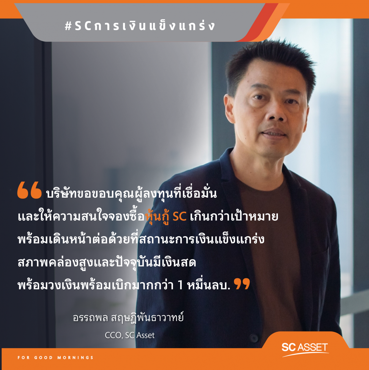 บริษัท เอสซี แอสเสท คอร์ปอเรชั่น จำกัด (มหาชน) “ผู้พัฒนาอสังหาริมทรัพย์ชั้นนำและส่งมอบ Living Solutions เพื่อทุกเช้าที่ดี” หรือ SC ขอขอบคุณผู้ลงทุนที่ให้ความสนใจจองซื้อหุ้นกู้เกินกว่าเป้าที่คาดหมายแม้อยู่ในช่วงท่ามกลางสถานการณ์โควิด ตอกย้ำความเชื่อมั่นในศักยภาพและการเติบโตของบริษัท