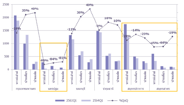 การระบาดของโรคโควิด-19 ระลอก 3 เริ่มมีผลกระทบชัดเจน ในพื้นที่ที่กำลังซื้อหลักเป็นพนักงานในนิคมอุตสาหกรรมหรือกลุ่มโรงงานซึ่งมีโอกาสที่จะชะลอตัวอย่างต่อเนื่อง โดยเป็นผลกระทบโดยตรงจากรายได้ที่ไม่แน่นอนและการระบาดของคลัสเตอร์ใหม่ในกลุ่มโรงงาน สะท้อนให้เห็นจากยอดการโอนกรรมสิทธิ์ของบ้านใหม่ (นิติบุคคล) ในไตรมาสแรกปีนี้ของกลุ่มสินค้าทาวน์เฮ้าส์ ที่ปรับตัวลดลงมากในจังหวัดนครปฐม (-88%) สมุทรสาคร (-45%) และ สมุทรปราการ (-28%)