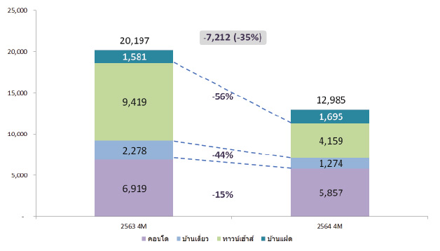 ส่วนภาพรวมการเปิดโครงการใหม่พื้นที่กรุงเทพฯและปริมณฑลในไตรมาสแรกปีนี้ มีการเปลี่ยนแปลงลดลงอย่างมีนัยยะสำคัญ เมื่อเปรียบเทียบกับไตรมาสแรกของปี 2563 โดยมีจำนวนยูนิตเปิดใหม่รวม 12,985 ยูนิต ลดลง 7,212 ยูนิต (-35%) จากการที่ผู้ประกอบการเริ่มปรับตัวโดยจับกลุ่มเป้าหมายที่ยังมีกำลังซื้อและได้รับผลกระทบจากโควิด-19 ไม่มาก