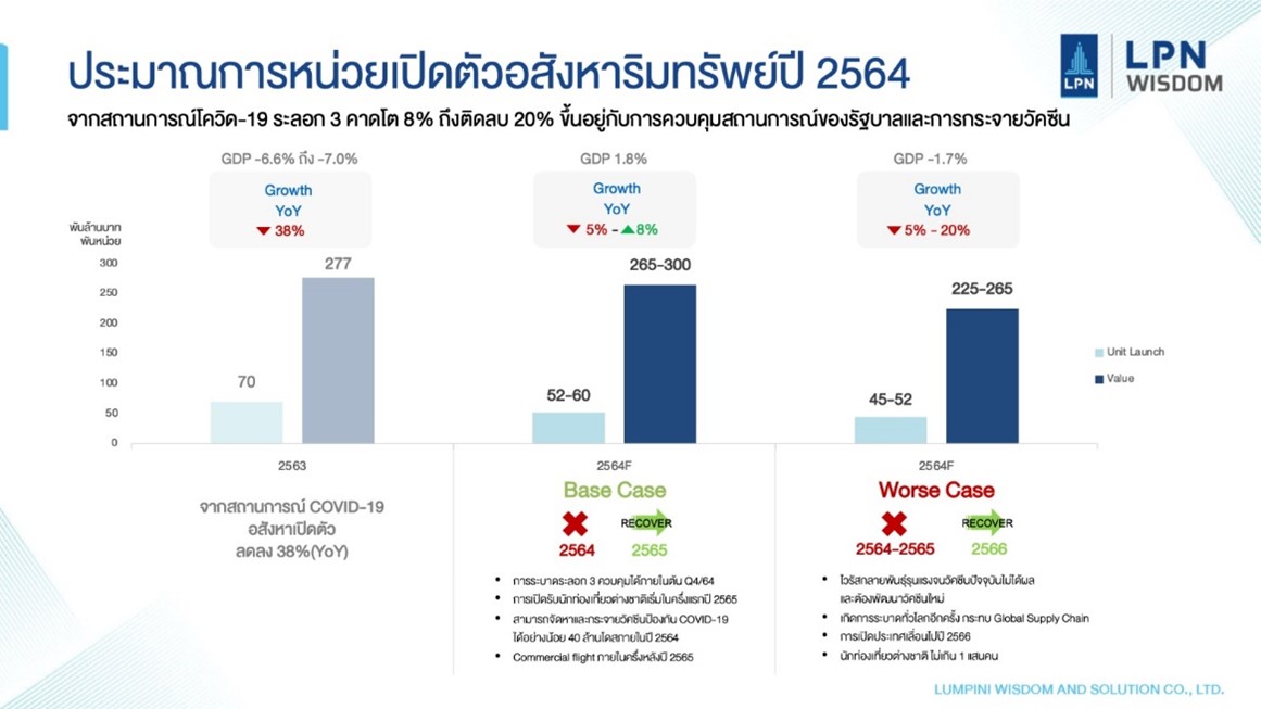 แต่ถ้ารัฐบาลไม่สามารถควบคุมสถานการณ์การแพร่ระบาด COVID-19 ได้ภายในปี 2564 นี้ คาดว่าตลาดที่อยู่อาศัย ในเขตกรุงเทพฯ และปริมณฑล จะมีจำนวนหน่วยที่อยู่อาศัยที่เปิดตัวใหม่อยู่ที่ประมาณ 45,000-52,000 หน่วย คิดเป็นมูลค่า 225,000-265,000 ล้านบาท หรือหดตัว 5% ถึง 20% ซึ่งเป็นการหดตัวต่อเนื่องเป็นปีที่ 2 ติดต่อกันจากปี 2563
