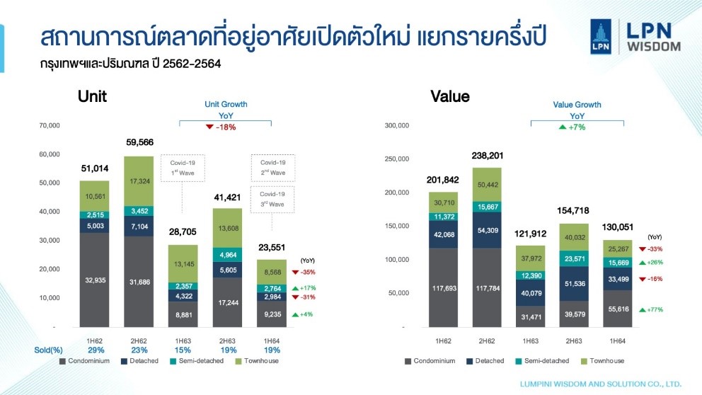 ในขณะที่ในช่วงครึ่งปีแรกของปี 2564 มีที่อยู่อาศัยเปิดตัวใหม่ในพื้นที่กรุงเทพฯและปริมณฑล จำนวนทั้งหมด 23,551 หน่วย ลดลง 18% เมื่อเทียบกับระยะเดียวกันของปี 2563 คิดเป็นมูลค่า 130,051 ล้านบาท เพิ่มขึ้น 7% เมื่อเทียบกับช่วงเดียวกันของปี 2563 จำนวนหน่วยการเปิดตัวลดลง แต่มูลค่าสูงขึ้นเนื่องจากมีการเปิดตัวโครงการ The Forestias