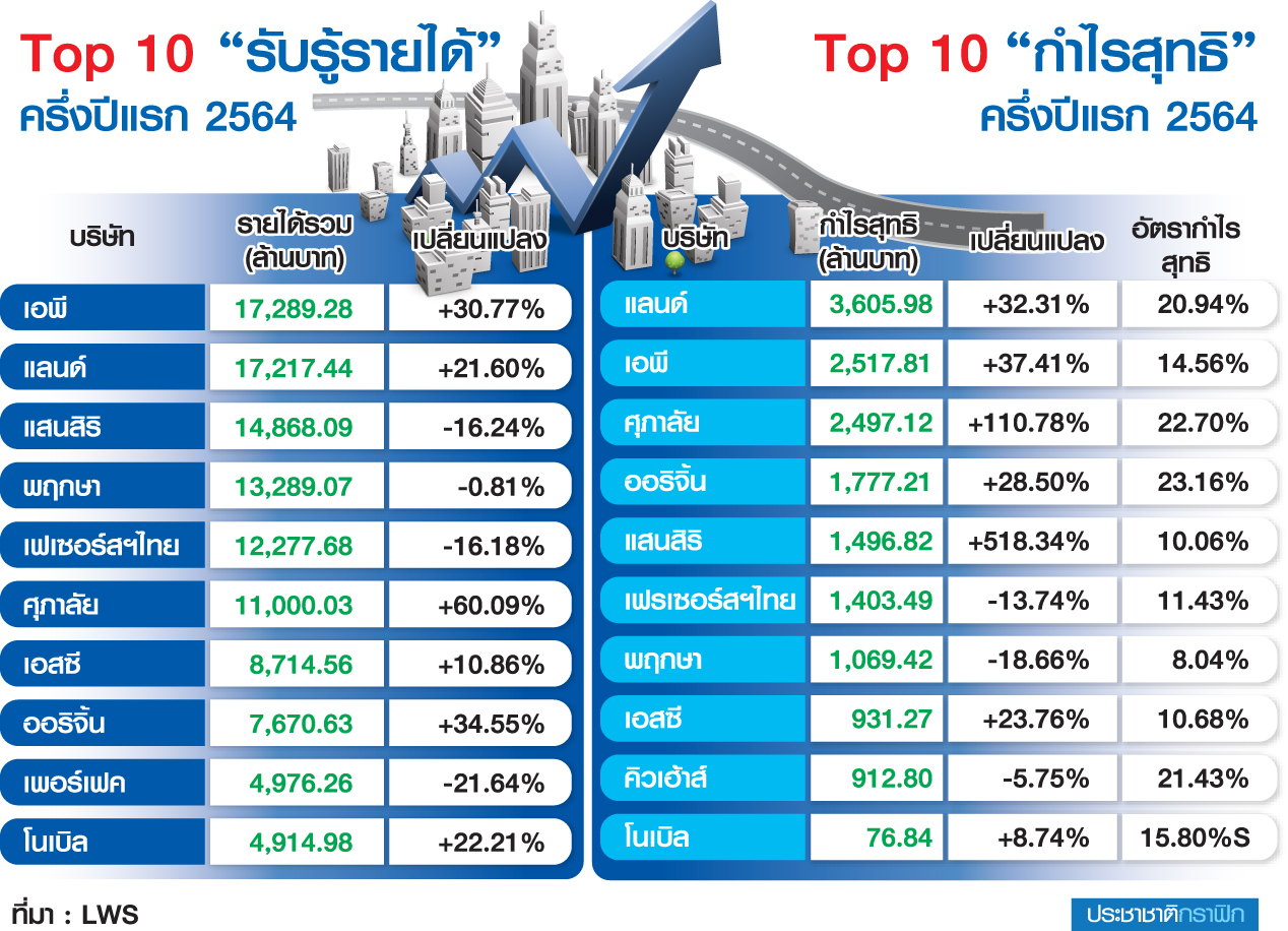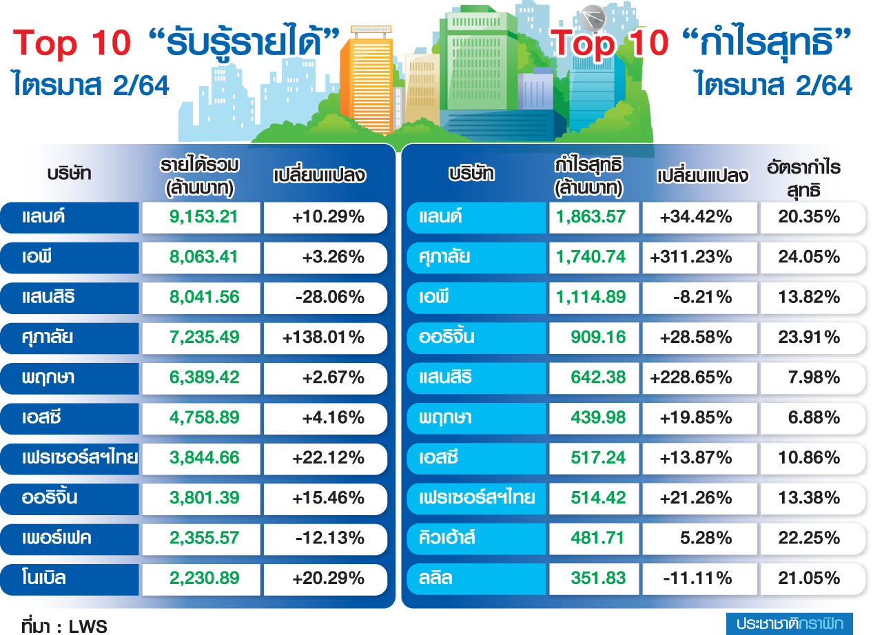 ทั้งนี้ทั้งนั้น ครึ่งปีแรก 2564 “AP-เอพี (ไทยแลนด์)” มีรายได้ 2 ไตรมาสรวมกันเติบโตสูงสุด ขณะที่ความสามารถในการทำกำไร “แลนด์” ยังมาแรง