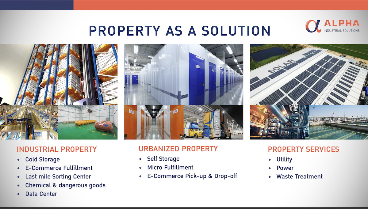 นายชวนินทร์ บัณฑิตกฤษดา ประธานเจ้าหน้าที่บริหาร บริษัท เจดับเบิ้ลยูดี อินโฟโลจิสติกส์ จำกัด (มหาชน) หรือ JWD กล่าวเพิ่มเติมว่า แอลฟา จะมุ่งดำเนินงานใน 3 กลุ่มธุรกิจหลัก ได้แก่ 1.อสังหาริมทรัพย์ภาคอุตสาหกรรม (Industrial Property) อาทิ คลังสินค้า ศูนย์โลจิสติกส์ สวนอุตสาหกรรม นิคมอุตสาหกรรม ระบบการจัดการคลังสินค้าออนไลน์ (Order Fulfillment)