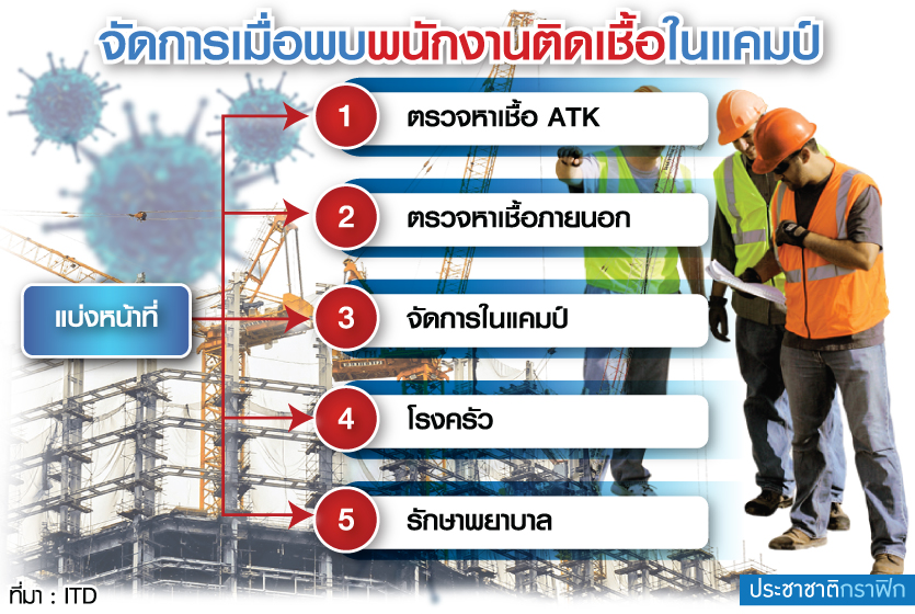 5.ขอคำแนะนำ เนื่องจาก ITD เป็นบริษัทรับเหมาก่อสร้าง ส่วนใหญ่มีวิศวกร สถาปนิก พนักงานบัญชี พนักงานสายช่าง ไม่มีความรู้โรคระบาด ต้องขอคำแนะนำจากสถาบันป้องกันควบคุมโรคเขตเมือง การรักษาเราก็ขอคำแนะนำจากแพทย์ที่โรงพยาบาลตำรวจหรือโรงพยาบาลภูมิพลซึ่งเราเคยทำงานร่วมกันมา