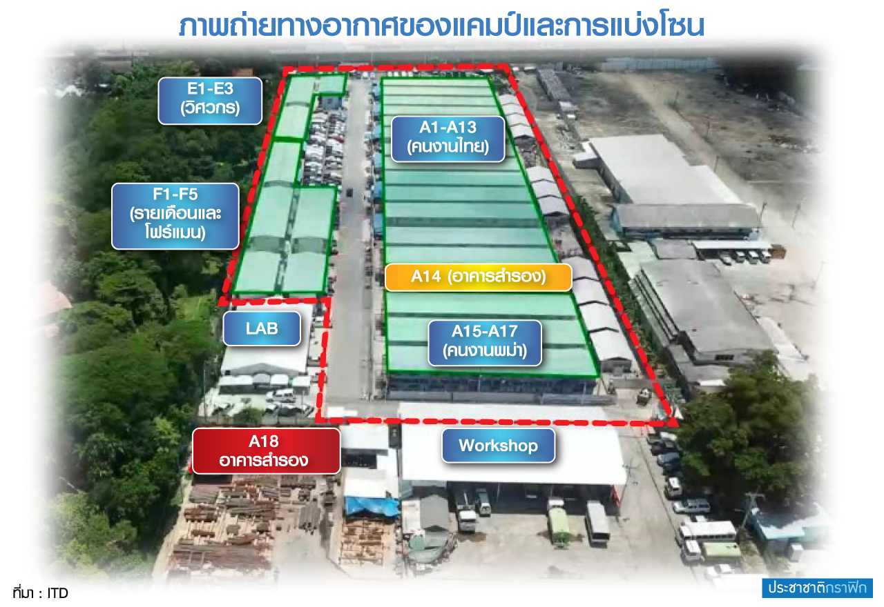 ในแคมป์มีอาคาร 9 หลังรองรับ 900 คน ช่วงก่อนล็อกดาวน์มีคนงานพัก 550 คน เป็นคนงานไทยของ ITD 280 คน กับคนงานต่างด้าว 270 คนของผู้รับเหมาช่วง ตรวจรอบแรกมีคนงานติดเชื้อ 185 คน หรือ 33%