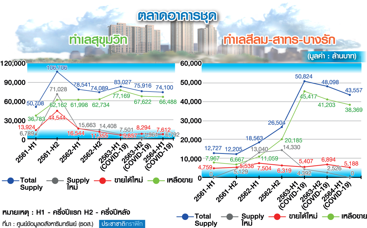 “ดร.วิชัย วิรัตกพันธ์” ผู้ตรวจการธนาคารอาคารสงเคราะห์ และรักษาการผู้อำนวยการศูนย์ข้อมูลอสังหาริมทรัพย์ (REIC) ระบุว่า ยุคโควิดอสังหาฯโซนไพรมแอเรียในกรุงเทพฯ ที่เป็นคอนโดมิเนียมจะมีซัพพลายสะสมจำนวนมาก ภาพรวมหน่วยเปิดใหม่ลดลงมาก มูลค่าก็ลดลง เหตุผลเพราะหน่วยขายใหม่เน้นเจาะตลาดไฮเอนด์ที่มีราคาสูง (ดูกราฟิก)