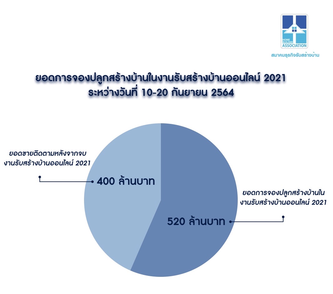 สมาคมธุรกิจรับสร้างบ้าน แจ้งผลการจัดงานรับสร้างบ้าน Online 2021 ตลอด 11 วัน ยอดคนเข้าชมงานผ่านเว็บไซต์ www.รับสร้างบ้านออนไลน์.com ทะลุ 57,000 ราย ขณะที่ยอดจองปลูกสร้างบ้านภายในงานได้กว่า 520 ล้านบาท คาดมียอดการจองปลูกสร้างบ้านตามมาอีกกว่า 400 ล้านบาท หลังจากจบงาน