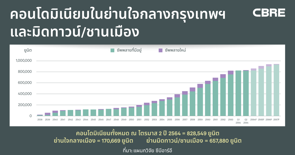 จากสถิติของแผนกวิจัย ซีบีอาร์อี พบว่า ณ ไตรมาส 2 ปี 2564 คอนโดมิเนียมทั้งหมดในกรุงเทพฯ มีจำนวนทั้งสิ้น 828,549 ยูนิต โดยยังอยู่ในระหว่างการก่อสร้าง 106,990 ยูนิต และก่อสร้างแล้วเสร็จจำนวน 7,983 ยูนิต ซึ่งมีเพียง 1,444 ยูนิตที่ตั้งอยู่ในย่าใจกลางธุรกิจหรือซีบีดี ปัจจุบันโครงการคอนโดมิเนียมที่ก่อสร้างแล้วเสร็จมียอดขายเฉลี่ย 90.9% ขณะที่โครงการคอนโดมิเนียมที่ยังอยู่ในระหว่างการก่อสร้างมียอดจองเฉลี่ย 61.4% โดยคอนโดมิเนียมระดับซูเปอร์ลักซ์ชัวรี่มียอดจองเฉลี่ยสูงสุดที่ 76.3%