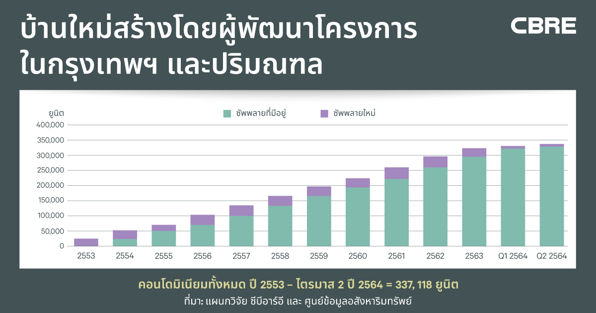ซัพพลายจากการเปิดตัวโครงการคอนโดมิเนียมใหม่จึงลดลงมาโดยตลอดตั้งแต่ปี 2563 และจากตัวเลขในไตรมาส 2 ปี 2564 ของซีบีอาร์อี พบว่า การเปิดตัวโครงการคอนโดมิเนียมใหม่ลดลงจากไตรมาสแรก 11.4% โดยผู้พัฒนาโครงการให้ความสำคัญกับการขายยูนิตที่สร้างเสร็จและพร้อมเข้าอยู่มากกว่า โดยมีข้อเสนอพิเศษเป็นตัวเร่งการตัดสินใจของลูกค้า ซึ่งส่วนใหญ่เป็นการให้ส่วนลด 5 - 10%”