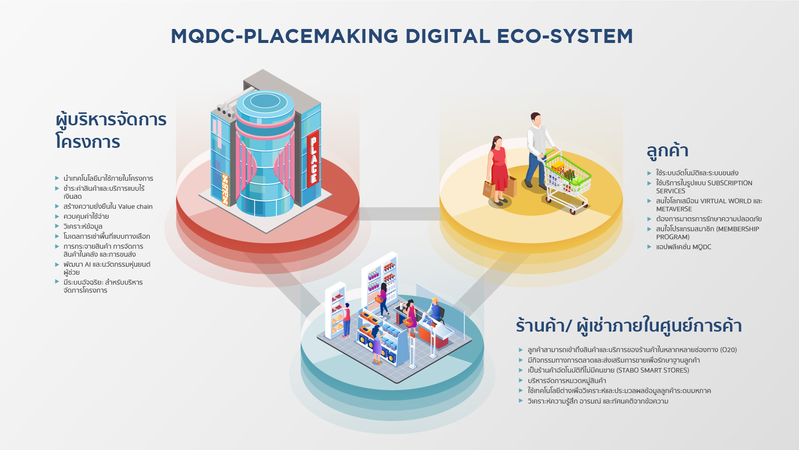 แผนแม่บทดิจิทัล MQDC Placemaking 5.0 มีวัตถุประสงค์เพื่อพัฒนาโครงการศูนย์การค้าและอาคารสำนักงานเข้าสู่ยุคดิจิทัลอย่างเต็มรูปแบบ โดยจะใช้เทคโนโลยีในการจัดหาสินค้าและบริการ เพื่อทำให้เป็นสถานที่ที่ดึงดูดลูกค้าในชุมชนมารวมตัวและใช้เวลาร่วมกัน
