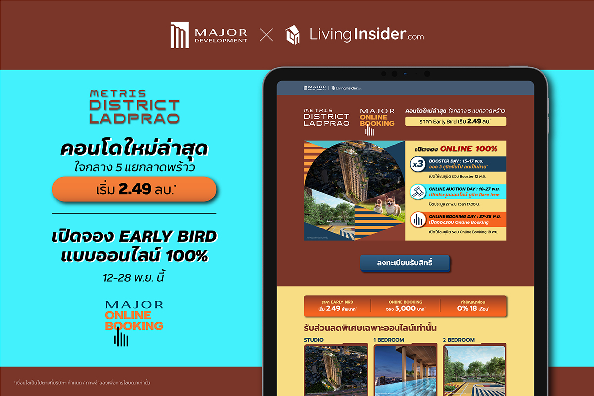 “เมเจอร์ ดีเวลลอปเม้นท์” ปรับกลยุทธ์เจาะตลาดผ่านออนไลน์ เปิดจองรอบ Early Bird ผ่าน Online 100% กับโครงการใหม่ “เมทริส ดิสทริค ลาดพร้าว” คอนโด Pet-Friendly Residences สำหรับคนรักสัตว์ ชูจุดเด่นแต่งครบ Fully Furnished ออกแบบฟังก์ชันเอาใจคน WFH ทุกยูนิต บนทำเลห้าแยกลาดพร้าว ใกล้ MRT พหลโยธินเพียง 230 ม.
