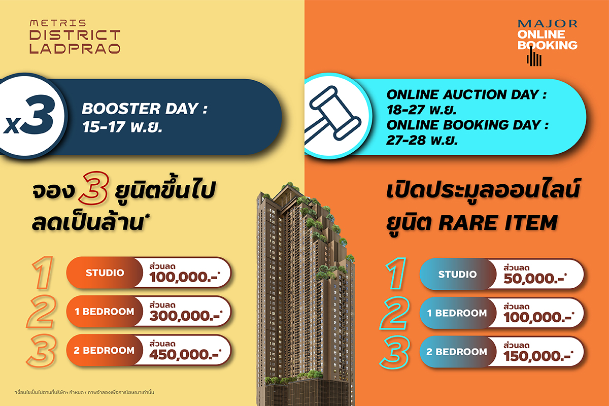 ผู้สนใจสามารถจองโครงการเมทริส ดิสทริค ลาดพร้าว (Metris District Ladprao) ในราคา 5,000 บาท โดยเยี่ยมชมยูนิตสำหรับเปิดจอง Online Booking ผ่านทาง https://condomajor.livinginsider.com ได้ตั้งแต่วันที่ 12 พ.ย.64 เป็นต้นไป และเปิดให้จอง Early Bird ผ่านทาง Online Booking 100% ทั้งหมด 3 รอบ ได้แก่