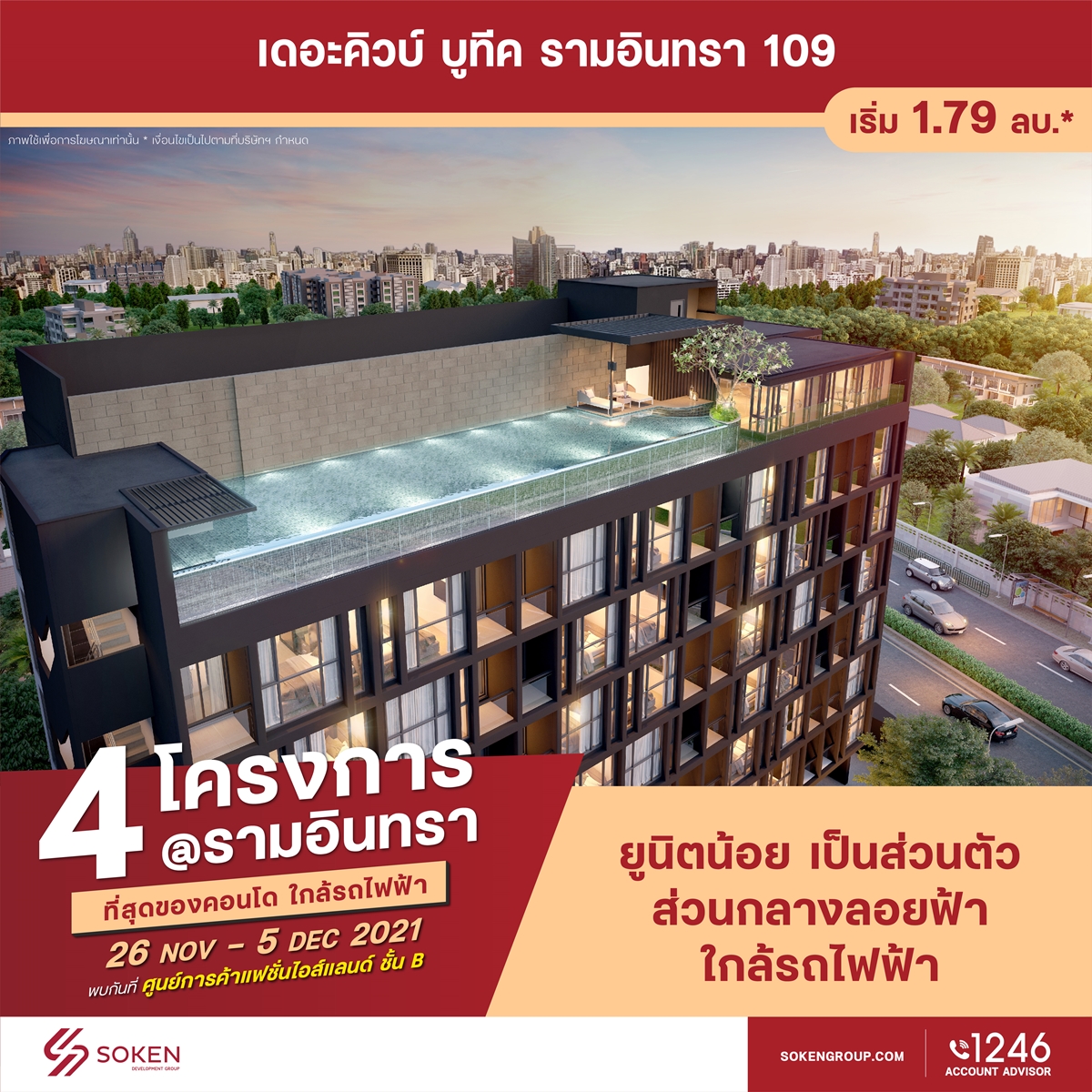 และ The Cube Boutique Ramintra 109 (เดอะคิวบ์ บูทีค รามอินทรา 109) (พร้อมโอนกรรมสิทธิ์และเข้าอยู่ต้นปี 2565) ราคาเริ่มต้น 1.79 ล้านบาท* จองและทำสัญญาซื้อโครงการภายในงาน