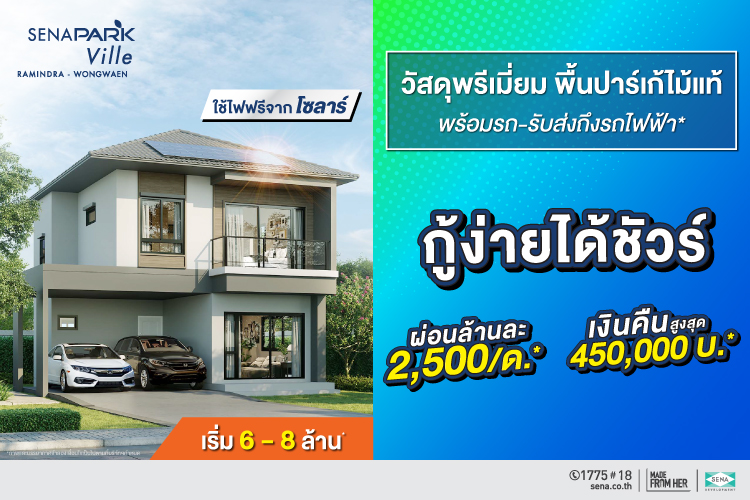 SENA ขานรับผ่อนคลายมาตรการ LTV จัดแคมเปญกระตุ้นยอดขายทิ้งทวนส่งท้ายปีวัว “กู้ง่ายได้ชัวร์” ผ่อนล้านละ 1,500 บาท ฟรี!ค่าโอนฯ พร้อมรับเงินคืนสูงสุด 1.5 ล้านบาท ส่ง 10 โครงการทั้งแนวราบ – ทาวน์โฮมทำเลคุณภาพทั้งในกรุงเทพฯ และต่างจังหวัด เริ่มตั้งแต่วันนี้จนถึงสิ้นปี 64