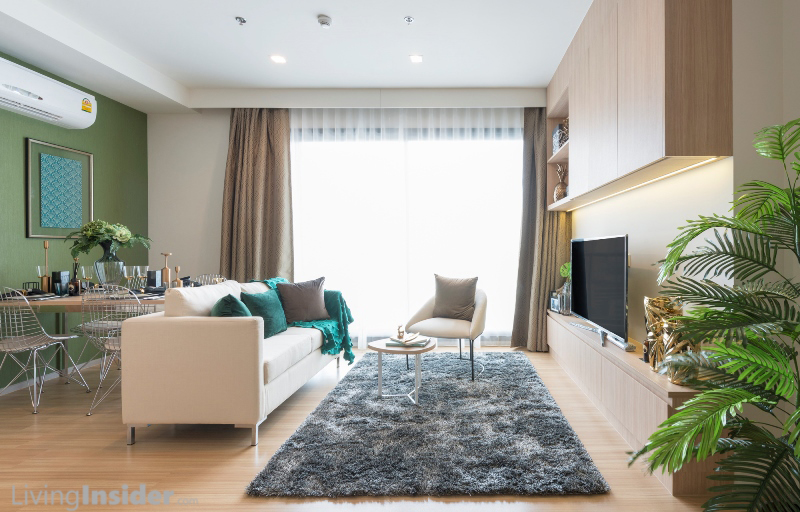 นอกจากห้องจะกว้างแล้ว โครงการยังแถมอีกเยอะมาก ไม่ว่าจะเป็นโซฟา โต๊ะกลาง ตู้วางทีวี ตู้เก็บของต่างๆมีให้เยอะมาก