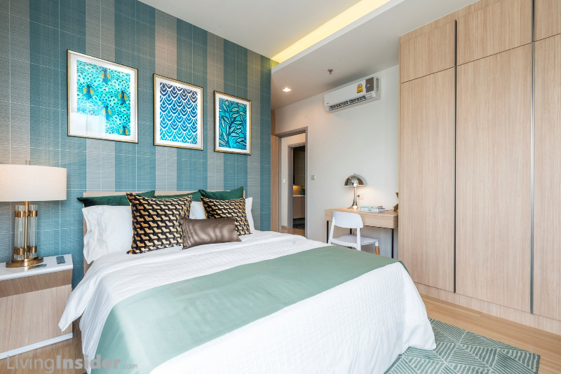 ปลายเตียงมีบิ้วท์อินตู้เสื้อผ้าและมีโต๊ะทำงานและสามารถเปิดโต๊ะแล้วกลายเป็นโต๊ะเครื่องแป้งได้ด้วยครับ
