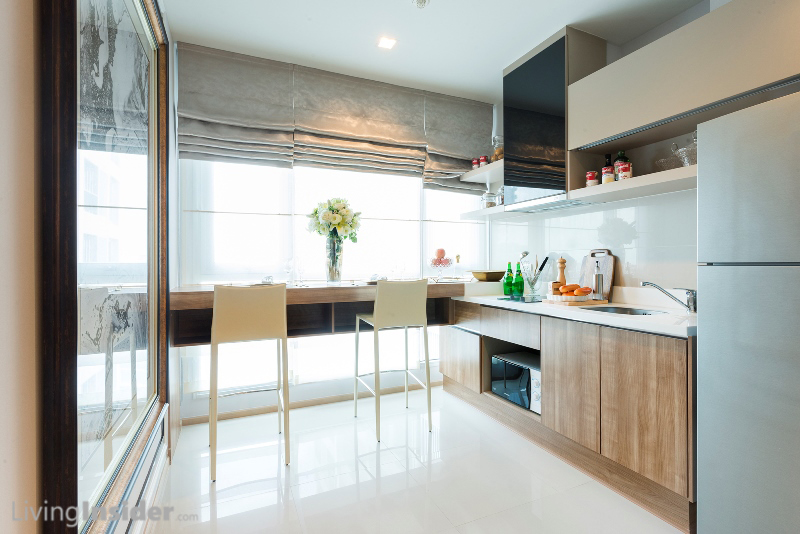 ส่วนครัวอยู่ด้านในสุด กั้นส่วนด้วยประตูเลื่อน 3 ตอน บิวท์อินบาร์นั่งพร้อมเก้าอี้ 3 ตัว นั่งทานข้าวชมวิวไปด้วย