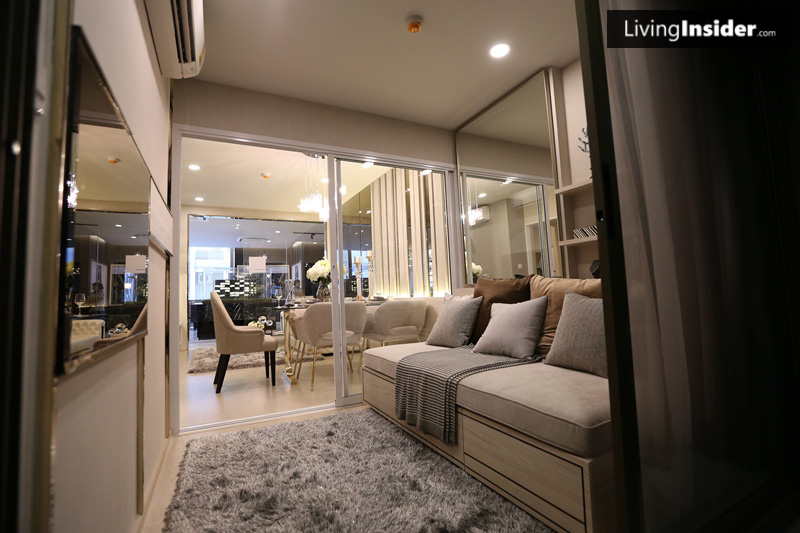 โครงการนี้ 1 ห้องนอน จะเป็นขนาด 30 ตรม. ขึ้นไป และออกแบบเป็นห้องหน้ากว้างนะครับ ทำให้ห้องนั่งเล่นค่อนข้างกว้างและใช้งานได้จริง โดยเพดานในห้องนั่งเล่นจะสูง 2.55 เมตร ซึ่งสูงกว่าคอนโด Low Rise ปกติที่จะได้ประมาณ 2.40 เมตร ทำให้ห้องดูกว้างขึ้นอีกเยอะเลยครับ