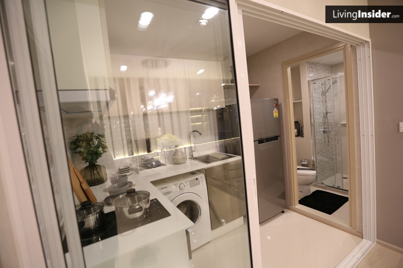 ที่นี่ให้ความสำคัญกับพื้นที่ทำอาหารมากเลยครับ โดยนอกจากจะสามารถแยกเป็นส่วนครัวปิดได้เแล้ว ยังมีพื้นที่ค่อนข้างกว้างเลยครับ จะเห็นว่าให้ชุดครัวเป็นตัวแอลเลย โดยชุดครัวเป็นของ Starmark แถมเตาไฟฟ้า, เครื่องดูดควันและซิ้งค์ล้างจานของ Franke (ระบบดูดควันเป็นแบบดูดออกไปข้างนอกนะครับ โดยมีท่อดูดออกไป ไม่ใช่แบบหมุนเวียนนะครับ นี่เป็นข้อดีมากครับ เพราะดูดกลิ่นได้ดีกว่า และ โดยทั่วไป คอนโด Low Rise จะไม่ค่อยทำระบบแบบนี้ให้ครับ )