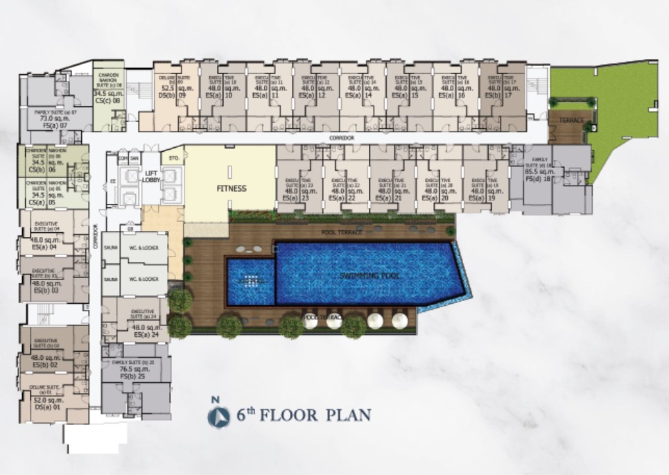 บริเวณชั้น 6 จะเป็นสระว่ายน้ำและห้องออกกำลังกายครับ