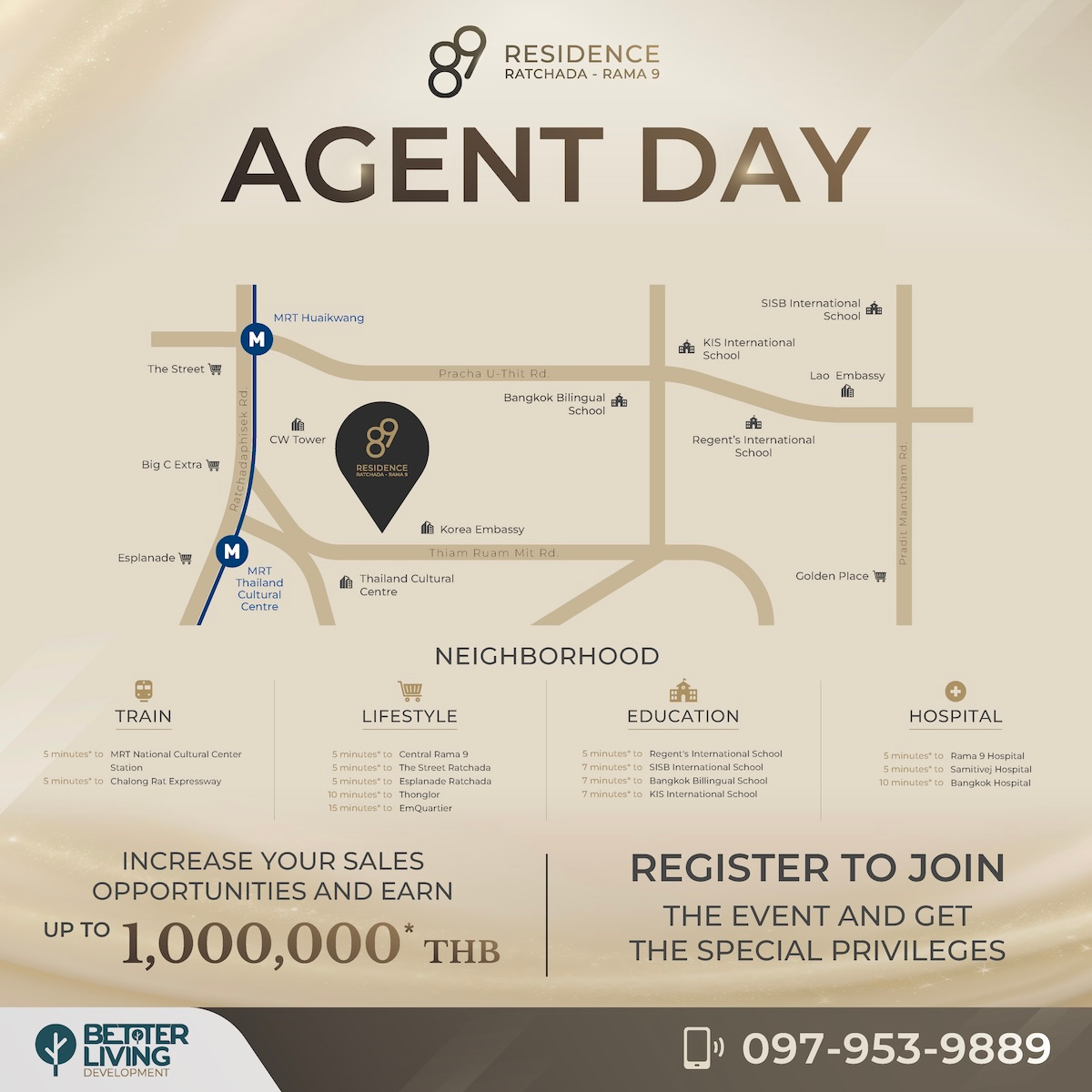 โครงการ 89 Residence ขอเรียนเชิญคุณเข้าร่วมงาน Agent Day รอบพิเศษ ค่าคอมมิชชั่นสูงถึง 5% ต่อยูนิต พบกับ บ้านโปรโมชั่นราคาพิเศษเฉพาะเอเจนต์ และ เปิดบ้านตัวอย่างตกแต่งพร้อมปล่อยเช่าเป็นครั้งแรก!