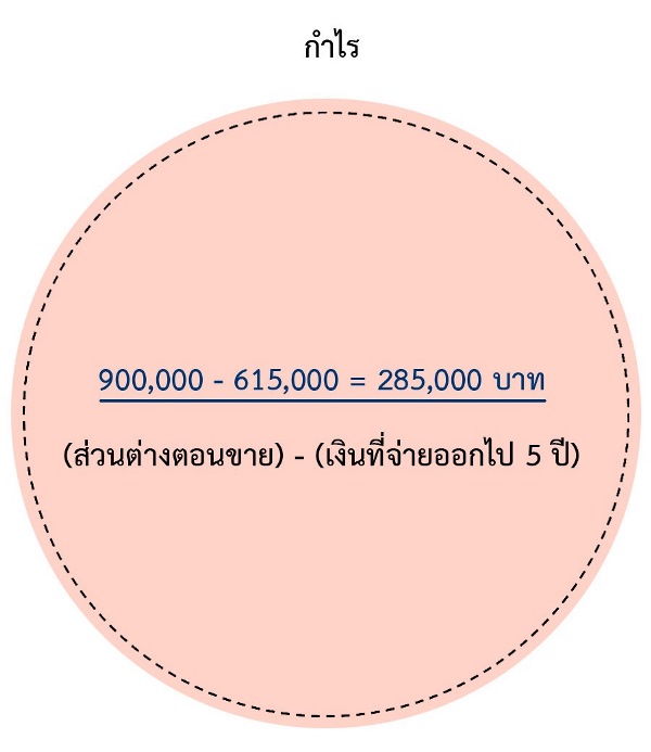 เงินที่ออกมาจากกระเป๋าคุณจริงๆแล้ว คือคุณผ่อนธนาคารและค่าส่วนกลางไป 5 ปี 615,000 บาท แล้วถ้าจะคำนวณว่าคุณได้กำไรเท่าไร ต้องคำนวณว่าคุณจ่ายไปเท่าไรก่อน แล้วมาดูว่าส่วนต่างที่คุณได้คืนมาจากวันที่คุณขายคุณได้เท่าไร ถึงจะรู้กำไรที่แท้จริง