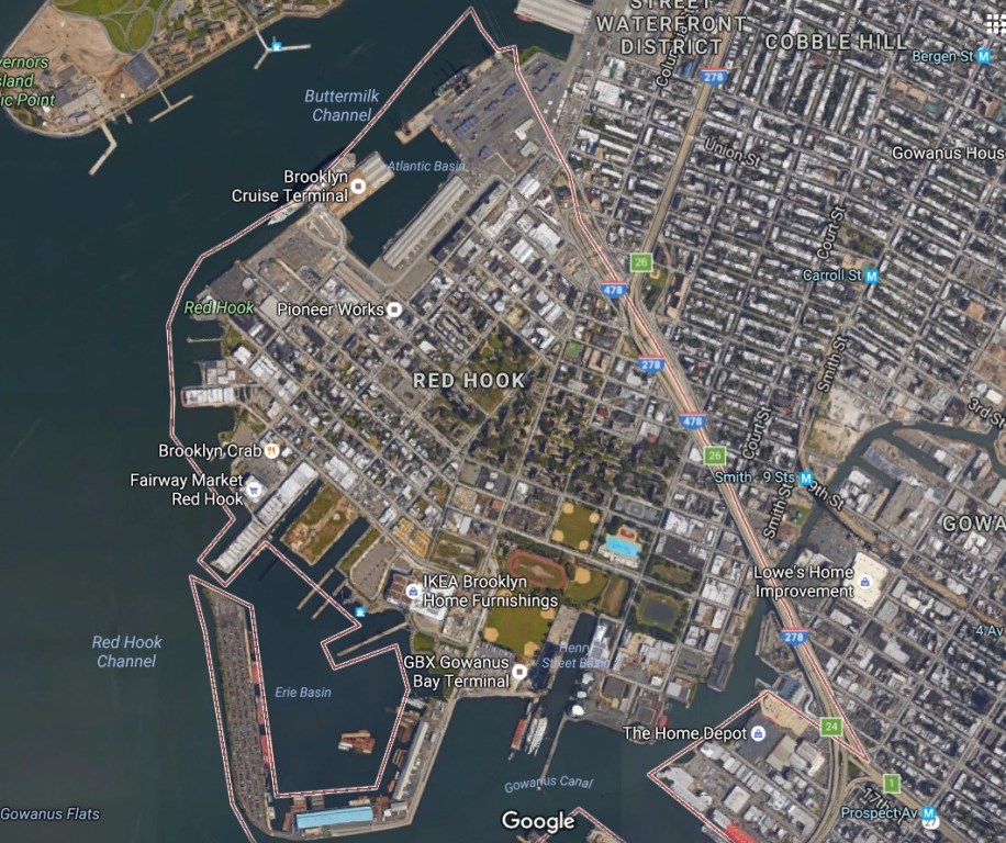 Red Hook Brooklyn เป็นย่านชายฝั่งที่อยู่ในเมืองบรู๊คลิน ที่นี่ไม่ใช่เป็นเมืองที่มีความวุ่นวายแบบเมืองหลวง ผู้คนที่นี่ใช้ชีวิตแบบสงบสุขและเรียบง่าย ส่วนใหญ่ที่นี่จะมีโรงงานอุตสาหกรรมและท่าเรือหลายแห่ง จะเห็นได้ชัดเจนว่าการก่อสร้างอาคารที่นี่มีการก่อด้วยอิฐสีแดงซึ่งเป็นเอกลักษณ์ของที่นี่ มีบางคนบอกว่าที่นี่ก็มีส่วนในการเป็นจุดกำเนิดของสไตล์การตกแต่งแบบ Industrial ที่กำลังฮิตกันอยู่ในปัจจุบัน