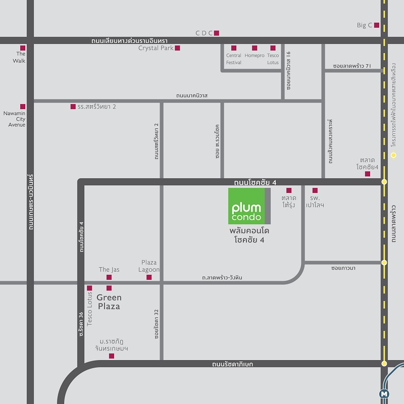 พลัมคอนโด โชคชัย 4 อยู่ห่างจากปากถนนลาดพร้าวประมาณ 2 กิโลเมตร เลยตลาดโต้รุ่ง และ รพ.เปาโลเพียงนิดเดียว โครงการฯ ที่ตั้งอยู่บนถนนโชคชัย 4 ระหว่างซอย 43 และซอย 45 เป็นถนนใหญ่ของโชคชัย 4 เลยนะครับ ไม่ได้เข้าซอยแบบคอนโดอื่นๆ แถวนี้เดินทางเข้า-ออกได้อย่างสะดวกสบาย ทั้งถนนลาดพร้าว ถนนรัชดาภิเษก ถนนเอกมัย-รามอินทรา และถนนเกษตร-นวมินทร์