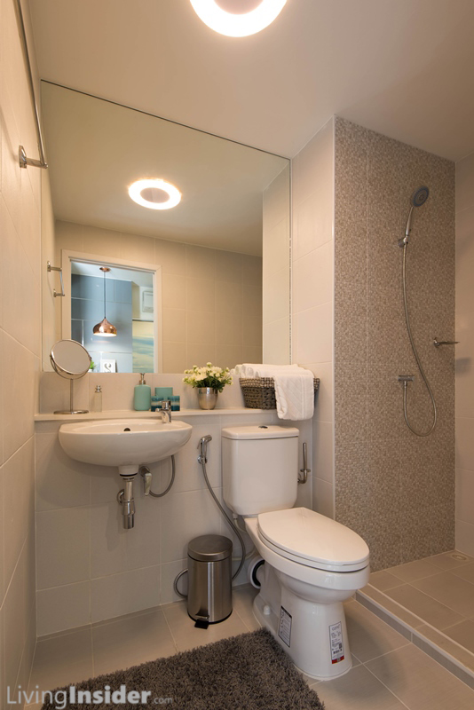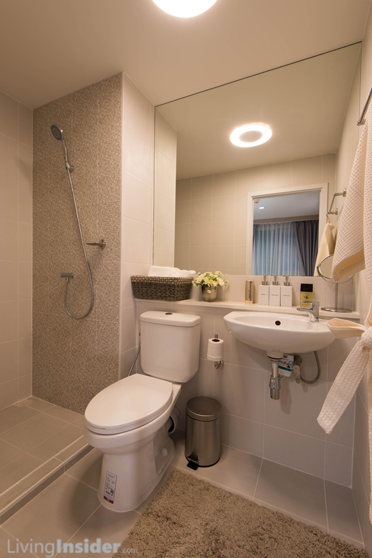 ห้องน้ำเป็นห้องน้ำแบบสำเร็จ แยกส่วนที่เปียกและส่วนที่แห้ง อุปกรณ์ในห้องน้ำทั้งหมดเป็นของ COTTO