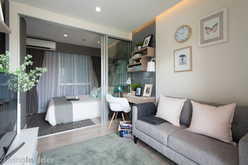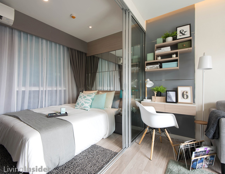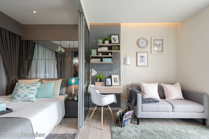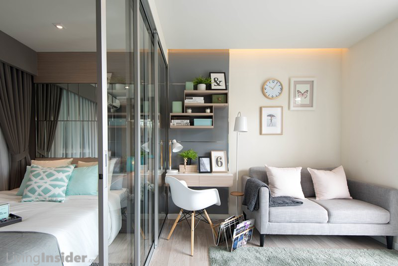 มีการแยกสัดส่วนห้องนั่งเล่น ห้องนอน ด้วยประตูกระจกสไลด์
