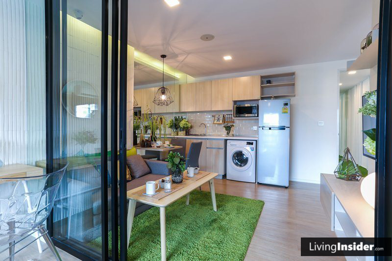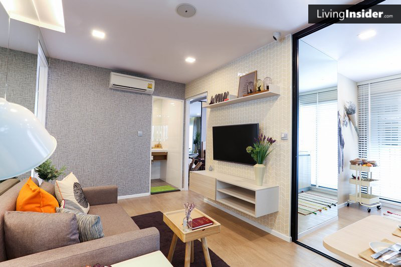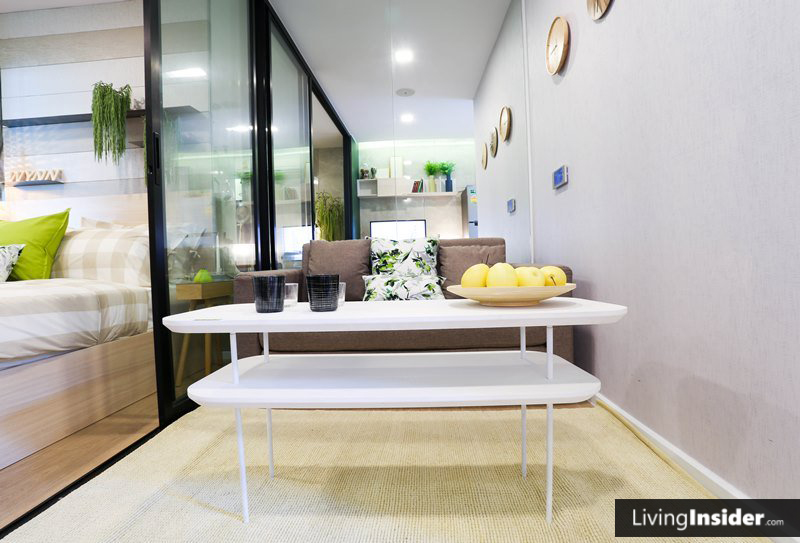 ห้องนี้จะไม่มีพื้นที่วางโต๊ะทานอาหารนะครับ แต่ก็สามารถใช้โต๊ะกลางหน้าโซฟาแทนโต๊ะอาหารได้ โดยนั่งกับพื้นเอา ผมว่าก็ปกตินะ ชีวิตคนเมืองก็แบบนี้แหละครับ ส่วนใหญ่ทานข้าวนอกบ้านกัน
