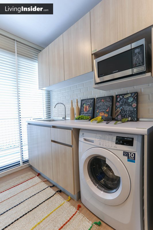 ส่วนครัวเป็นแบบปิดนะครับ และมีพื้นที่เชื่อมต่อกับระเบียง ใช้ระบายอากาศได้ แถมชุดครัวยังมีพื้นที่เยอะด้วย ใครชอบทำอาหารน่าจะชอบแน่นอนครับ