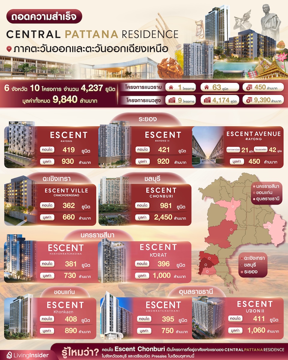 อีกทั้งยังได้รับรางวัลการันตีจากเวที Livinginsider Thailand Developer Awards 2025 สาขา Best Regional Developer of the Year (Eastern & Northeastern) ซึ่งยิ่งเป็นการตอกย้ำถึงความเป็นผู้นำตลาดอสังหาฯ ภาคตะวันออกและภาคตะวันออกเฉียงเหนือ จากการพัฒนาที่อยู่อาศัยใน 6 จังหวัด รวม 10 โครงการ จำนวน 4,237 ยูนิต มูลค่าโครงการรวม 9,813 ล้านบาท แบ่งเป็นโครงการแนวราบ 1 โครงการ จำนวน 63 ยูนิต มูลค่ารวม 454 ล้านบาท และโครงการแนวสูง 9 โครงการ จำนวน 4,174 ยูนิต มูลค่ารวม 9,359 ล้านบาท
