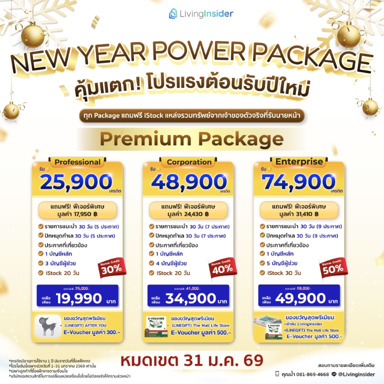 ถ้าคุณเป็นนายหน้า คุณจะรู้ว่า…ปีนี้ลูกค้าตัดสินใจช้า แข่งขันสูง และทุกคนมีประกาศเยอะพอ ๆ กัน สิ่งที่ทำให้ “ปิดดีล” ไม่ใช่แค่ลงประกาศเพิ่มแต่คือ มีสต๊อกที่ใช่ + ให้ลูกค้าเห็นประกาศของคุณก่อน และนี่คือเหตุผลที่ New Year Power Package คุ้มและ “จำเป็น” สำหรับนายหน้าในปีนี้