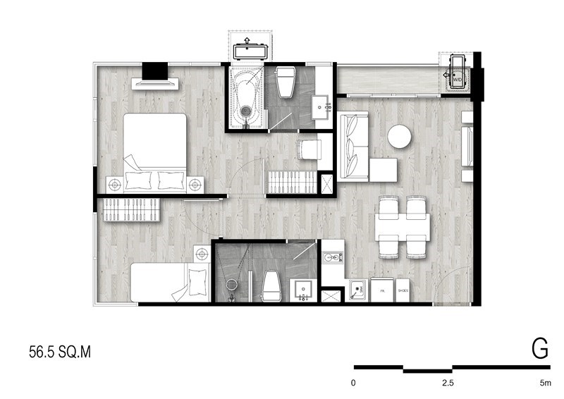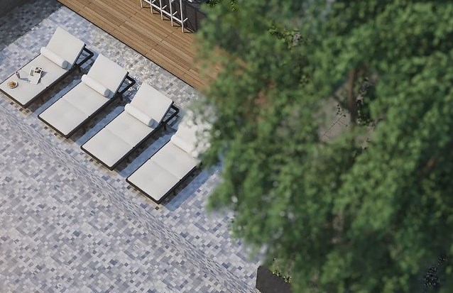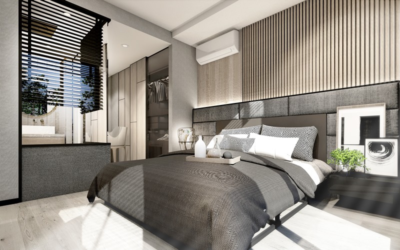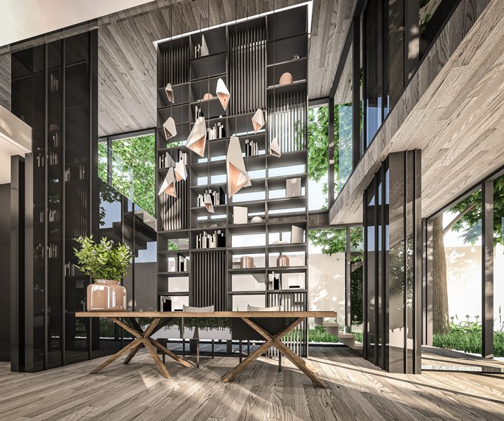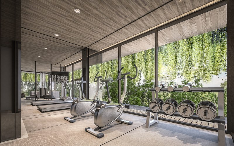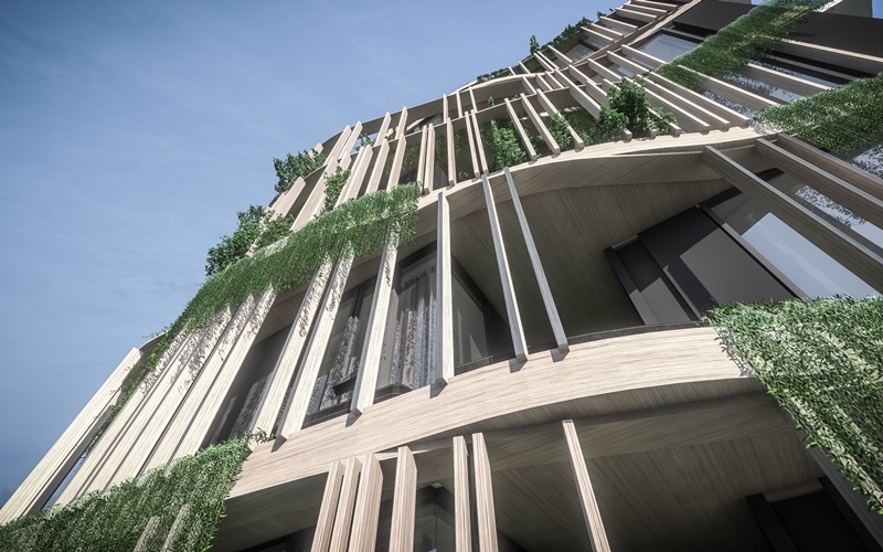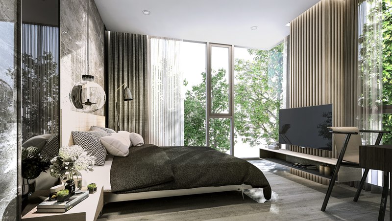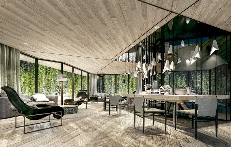 โทนต้นไม้กับสายน้ำพร้อมสีพื้นไม้ เพื่อให้ความสบายใจในการอยู่อาศัย เหมือนปลีกออกจากความวุ่นวายของโลกภายนอกมาในพื้นที่ส่วนตัวอย่างแท้จริง ดีไซน์มีส่วนโค้งและลดหลั่นกันไปจากชั้นล่างจนชั้นบนสุด เพื่อให้หลุดจากความรู้สึกของการเป็นเหลี่ยมแบบเดิมๆ