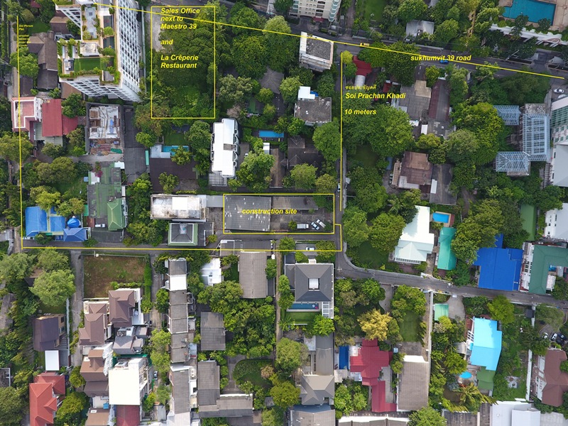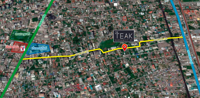 จากภาพทางอากาศเห็นได้ชัดว่าบ้านแถวนี้เค้าปลูกต้นไม้เยอะมากๆ (Sales office ของ The Teak อยู่ติดถนนหลักข้างๆ คอนโด Maestro 39 ไม่ได้อยู่ตรงตำแหน่งที่สร้างโครงการนะครับ)