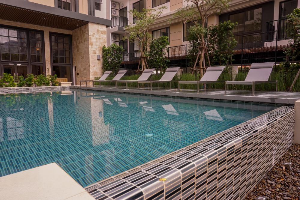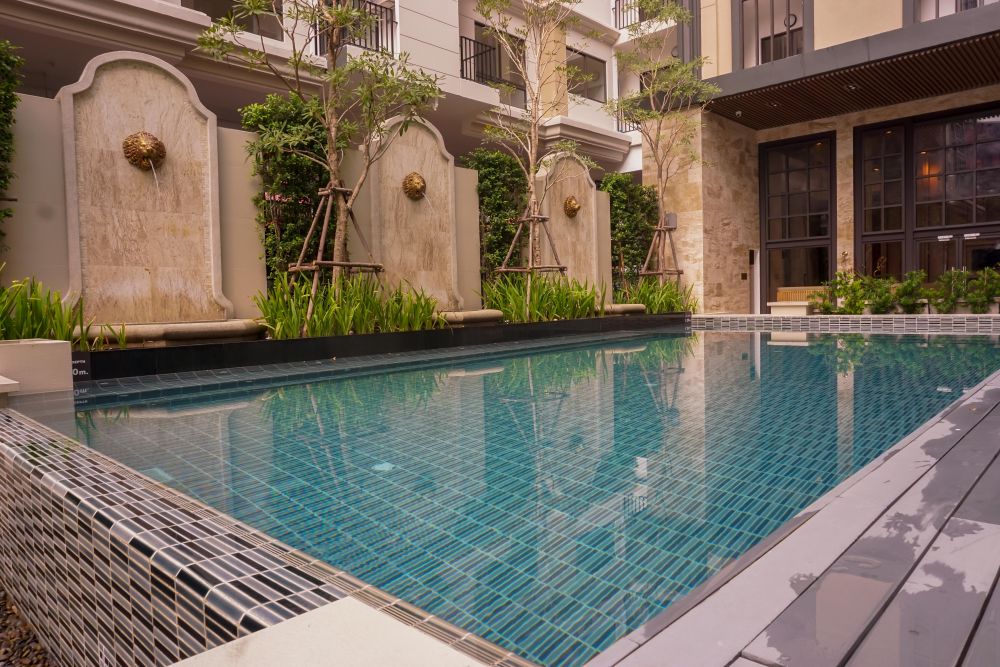 ส่วน Facility หลักของโครงการอย่างสระว่ายน้ำถูกออกแบบให้อยู่ตรงคอร์ทตรงกลางอาคาร ทำให้ร่มรื่นโดยธรรมชาติเพราะตัวอาคารช่วยบังแดดได้อย่างดี